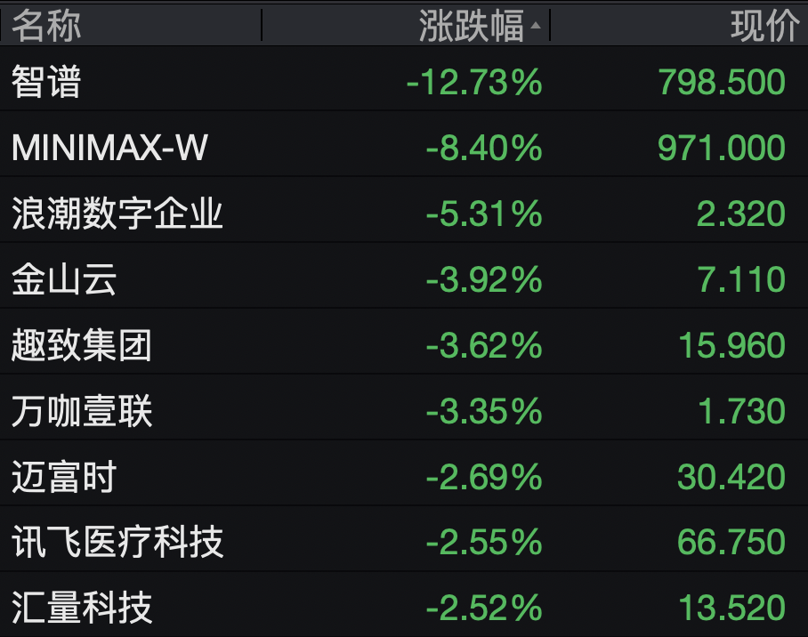 4月2日,港股AI大模型概念股普跌,其中,智谱跌近13%,MINIMAX跌超8%,金山云、趣致集团均跌超3%。